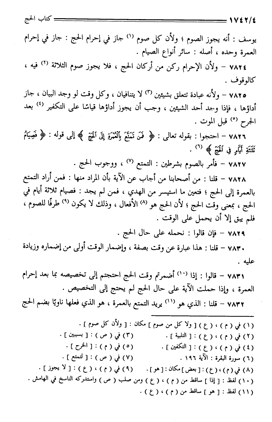 7826 - احتجوا: بقوله تعالى: {فمن تمتع بالعمرة إلى الحج} إلى قوله: {صيام ثلاثة أيام في الحج}.