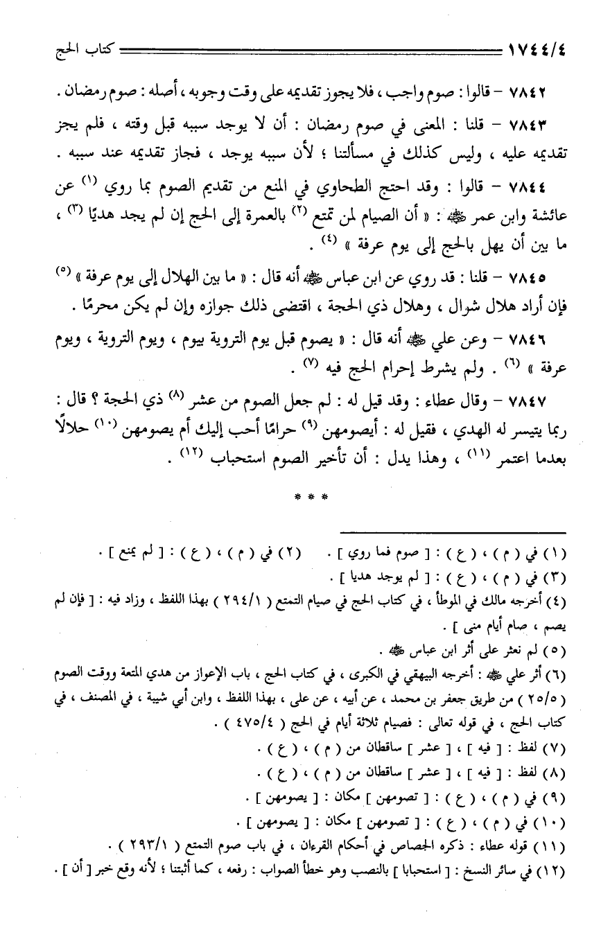 7844 - قالوا: وقد احتج الطحاوي في المنع من تقديم الصوم بما روي عن عائشة وابن عمر - رضي الله عنه -: (أن الصيام لمن تمتع بالعمرة إلى الحج إن لم يجد هديًا، ما بين أن يهل بالحج إلى يوم عرفة).