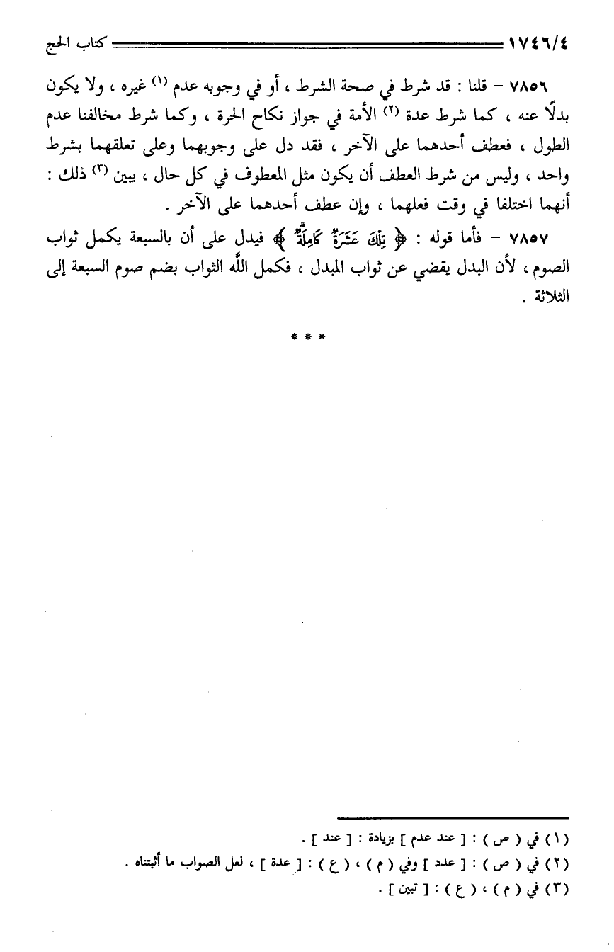 7857 - فأما قوله: {تلك عشرة كاملة} فيدل على أن بالسبعة يكمل ثواب الصوم، لأن البدل يقضي عن ثواب المبدل، فكمل الله الثواب بضم صوم السبعة إلى الثلاثة.