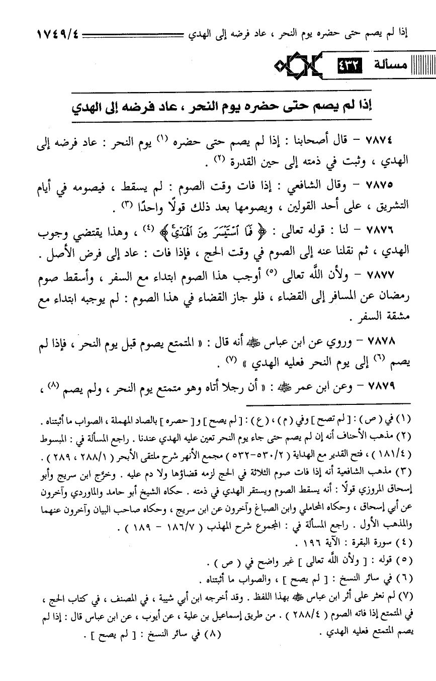 7874 - قال أصحابنا: إذا لم يصم حتى حضره يوم النحر: عاد فرضه إلى الهدي، وثبت في ذمته إلى حين القدرة.