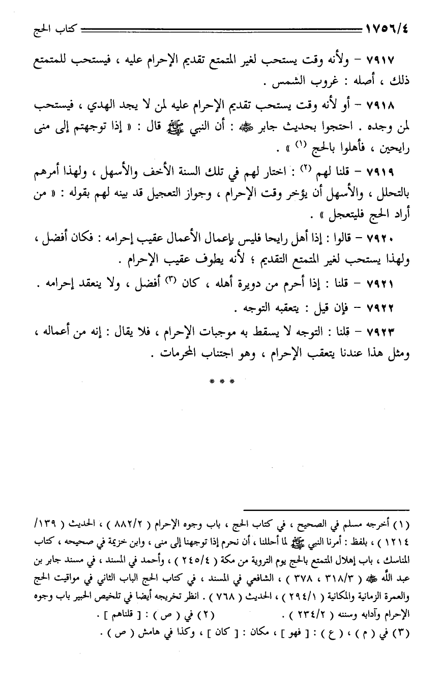 7920 - قالوا: إذا أهل رايحا فليس بإعمال الأعمال عقيب إحرامه: فكان أفضل، ولهذا يستحب لغير المتمتع التقديم؛ لأنه يطوف عقيب الإحرام.