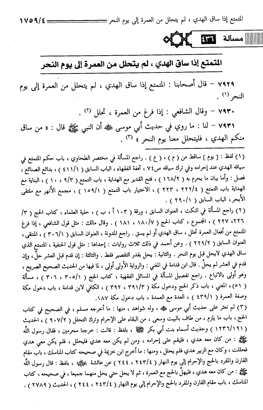 7931 - لنا: ما روي في حديث أبي موسى - رضي الله عنه - أن النبي - صلى الله عليه وسلم - قال: (من ساق منكم الهدي، فليتحلل معنا يوم النحر).