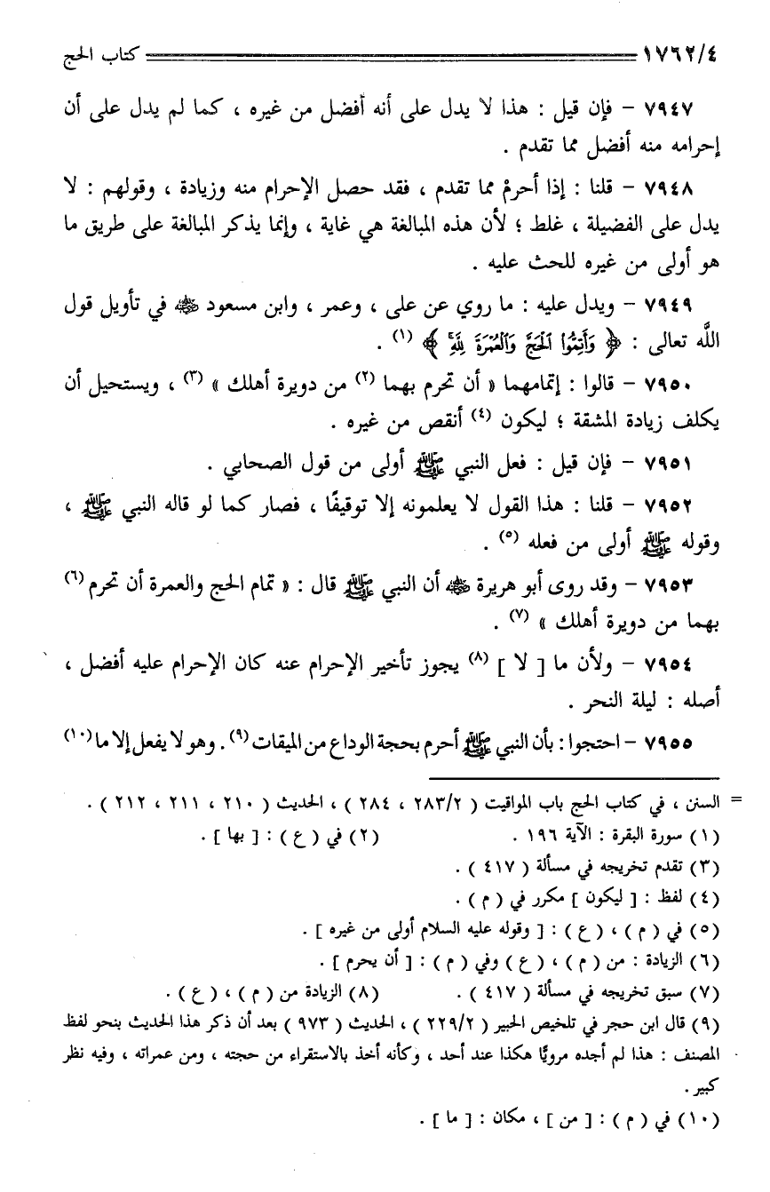 7949 - ويدل عليه: ما روي عن علي، وعمر، وابن مسعود - رضي الله عنه - في تأويل قول الله تعالى: {وأتموا الحج والعمرة لله}.