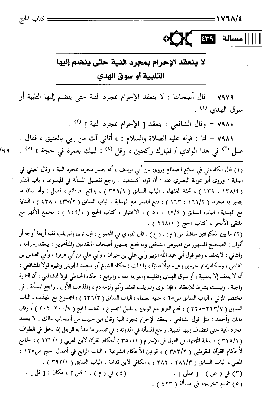 7979 - قال أصحابنا: لا ينعقد الإحرام بمجرد النية حتى ينضم إليها التلبية أو سوق الهدي.