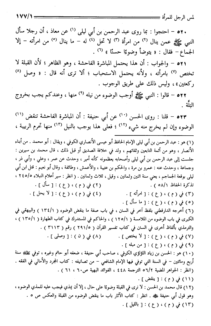 520 - احتجوا: بما روى عبد الرحمن بن أبي ليلى عن معاذ، أن رجلًا سأل النبي - صلى الله عليه وسلم - عمن ينال من امرأة لا تحل له -ما ينال من امرأته- إلا الجماع- فقال: ((يتوضأ وضوءًا حسنًا)).