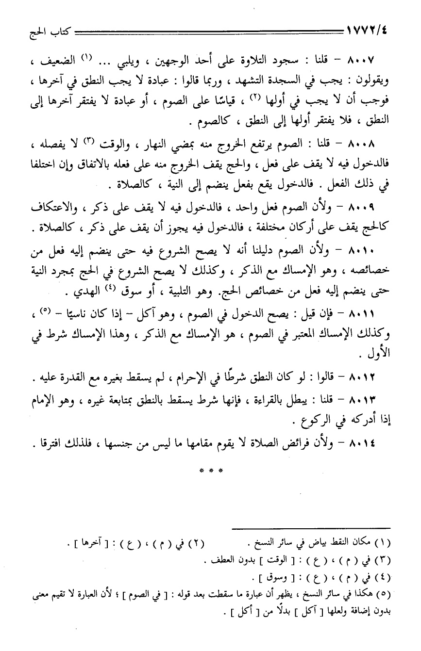8008 - قلنا: الصوم يرتفع الخروج منه بمضي النهار، والوقت لا يفصله، فالدخول فيه لا يقف على فعل، والحج يقف الخروج منه على فعله بالاتفاق وإن اختلفا في ذلك الفعل. فالدخول يقع بفعل ينضم إلى النية، كالصلاة.
