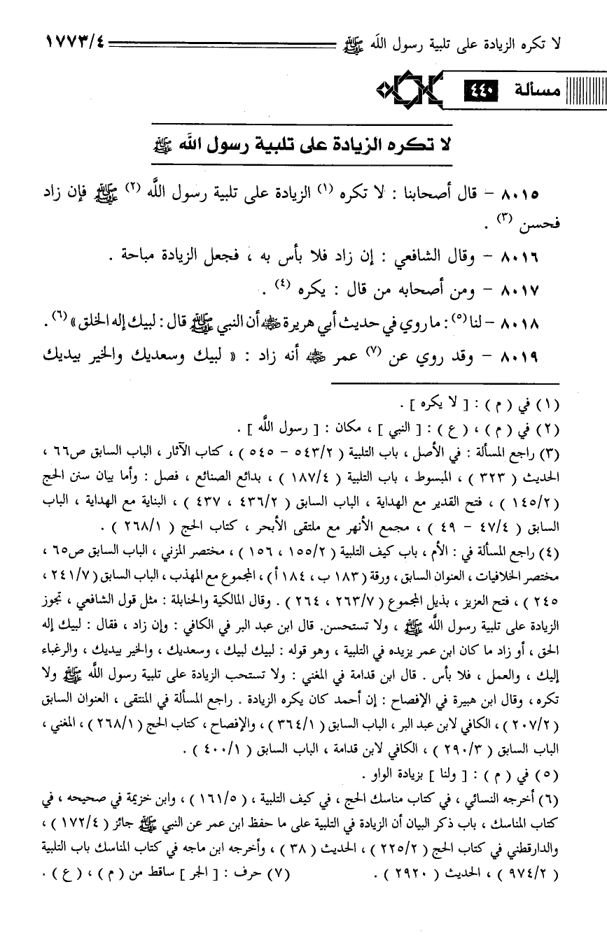 8015 - قال أصحابنا: لا تكره الزيادة على تلبية رسول الله - صلى الله عليه وسلم - فإن زاد فحسن.
