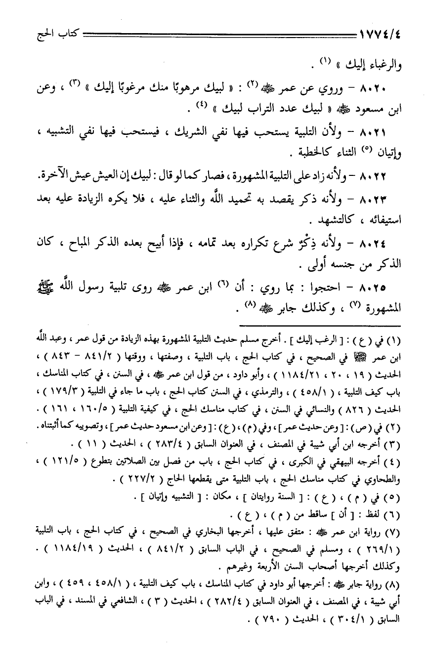 8025 - احتجوا: بما روي: أن ابن عمر - رضي الله عنه - روى تلبية رسول الله - صلى الله عليه وسلم - المشهورة، وكذلك جابر - رضي الله عنه -.