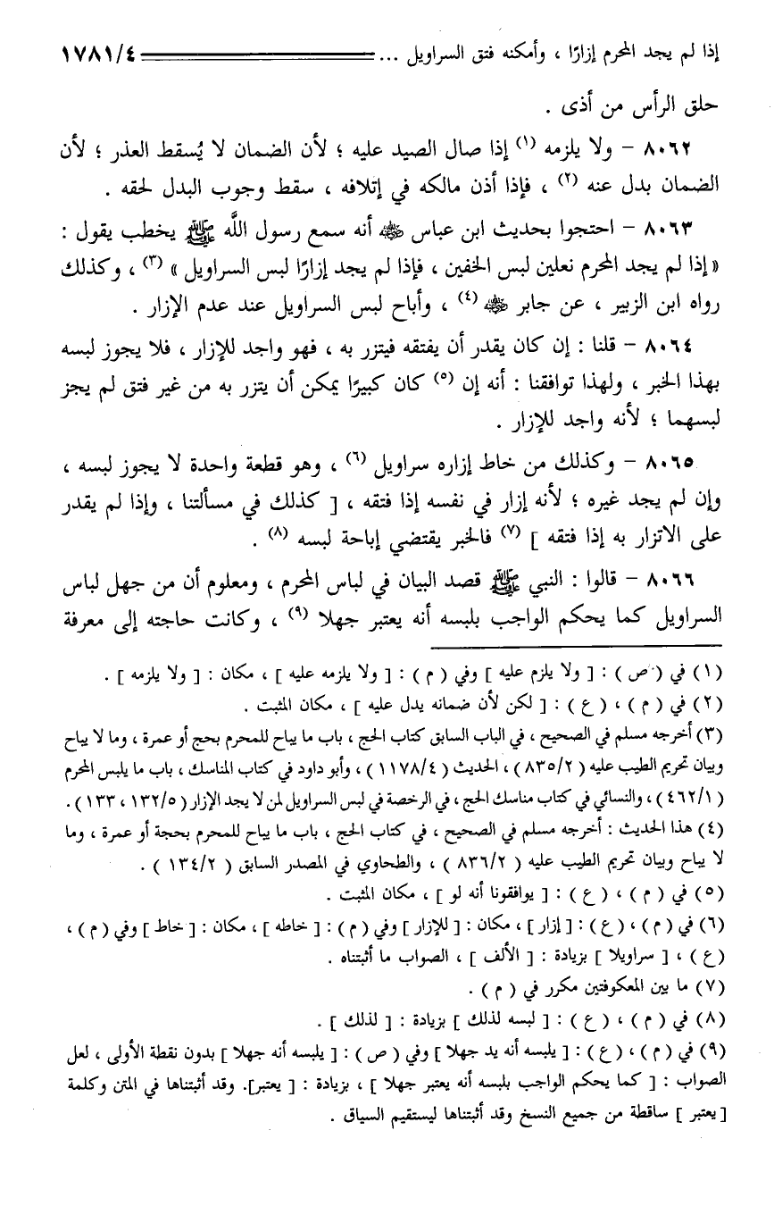8063 - احتجوا بحديث ابن عباس - رضي الله عنه - أنه سمع رسول الله - صلى الله عليه وسلم - يخطب يقول: (إذا لم يجد المحرم نعلين لبس الخفين، فإذا لم يجد إزارًا لبس السراويل)، وكلذك رواه ابن الزبير، عن جابر - رضي الله عنه -، وأباح لبس السراويل عند عدم الإزار.