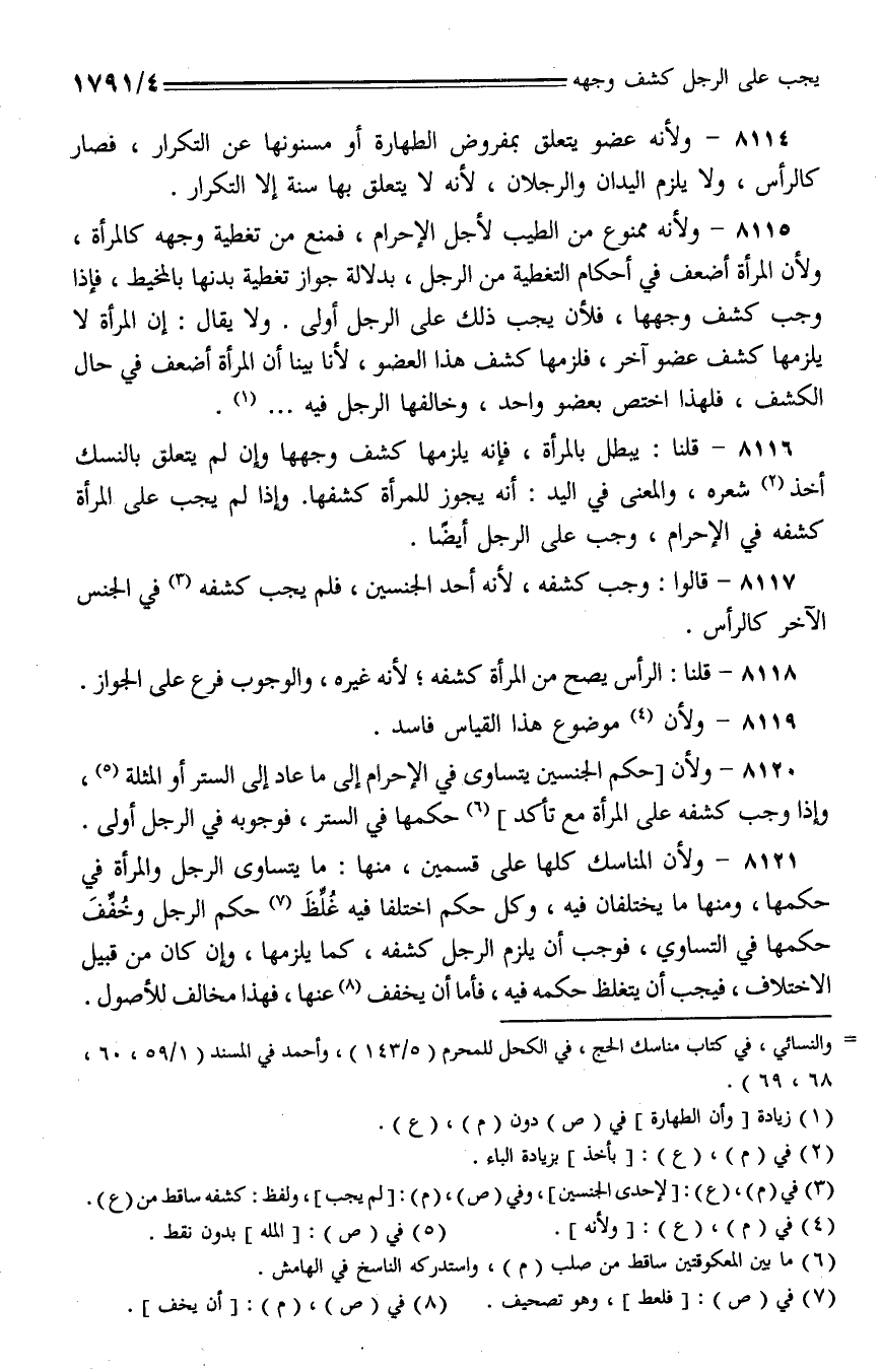 8120 - ولأن [حكم الجنسين يتساوى في الإحرام ما عاد إلى الستر أو المثلة، وإذا وجب كشفه على المرأة مع تأكد] حكمها في الستر، فوجوبه في الرجل أولى.