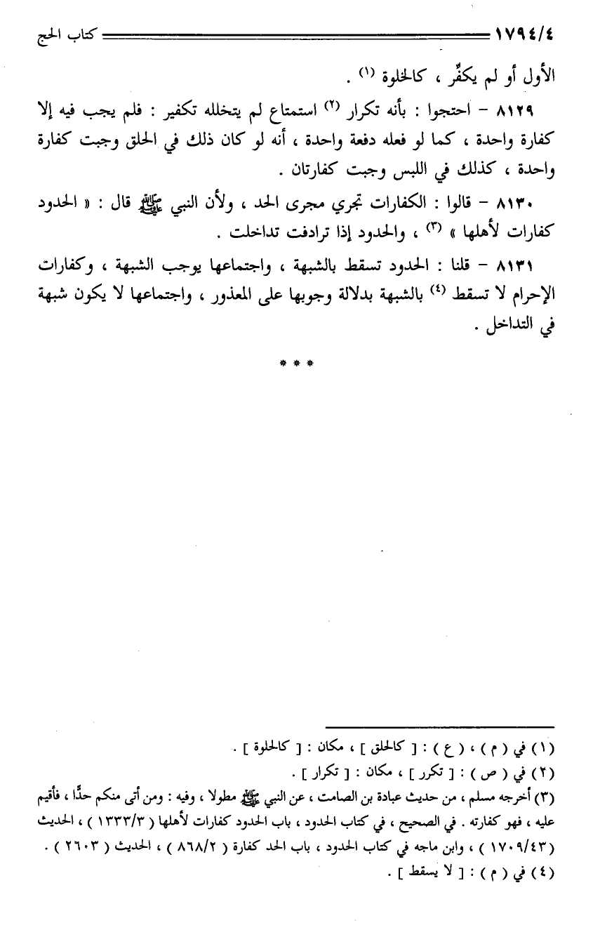 8131 - قلنا: الحدود تسقط بالشبهة، واجتماعها يوجب الشبهة، وكفارات الإحرام لا تسقط بالشبهة بدلالة وجوبها على المعذور، واجتماعها لا يكون شبهة في التداخل.
