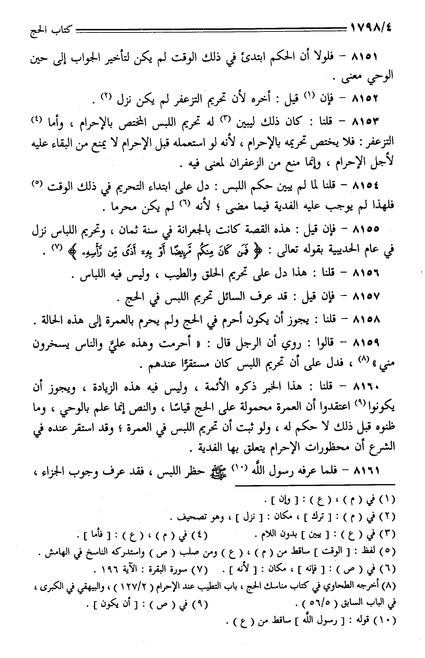 8160 - قلنا: هذا الخبر ذكره الأئمة، وليس فيه هذه الزيادة، ويجوز أن يكونوا اعتقدوا أن العمرة محمولة على الحج قياسًا، والنص إنما علم بالوحي، وما ظنوه قبل ذلك لا حكم له، ولو ثبت أن تحريم اللبس في العمرة؛ وقد استقر عنده في الشرع أن محظورات الإحرام يتعلق بها الفدية.