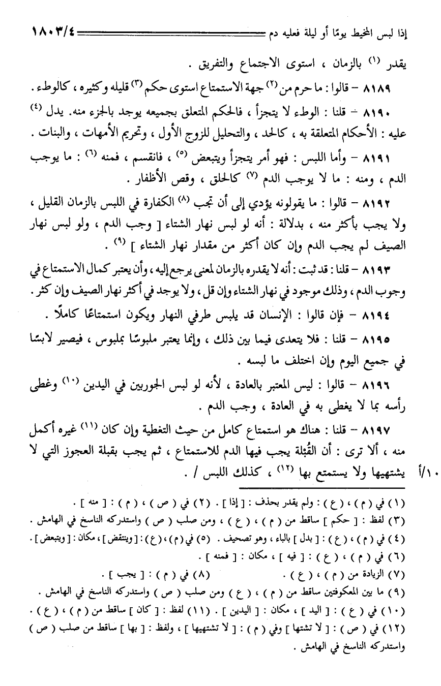 8193 - قلنا: قد ثبت: أنه لا يقدره بالزمان لمعنى يرجع إليه، وأن يعتبر كمال الاستمتاع في وجوب الدم، وذلك موجود في نهار الشتاء وإن قل، ولا يوجد في أكثر نهار الصيف وإن كثر.