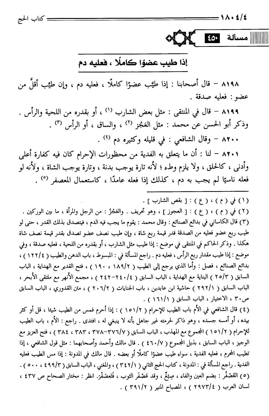 8198 - قال أصحابنا: إذا طيب عضوًا كاملاً، فعليه دم، وإن طيب أقل عضو: فعليه صدقة.