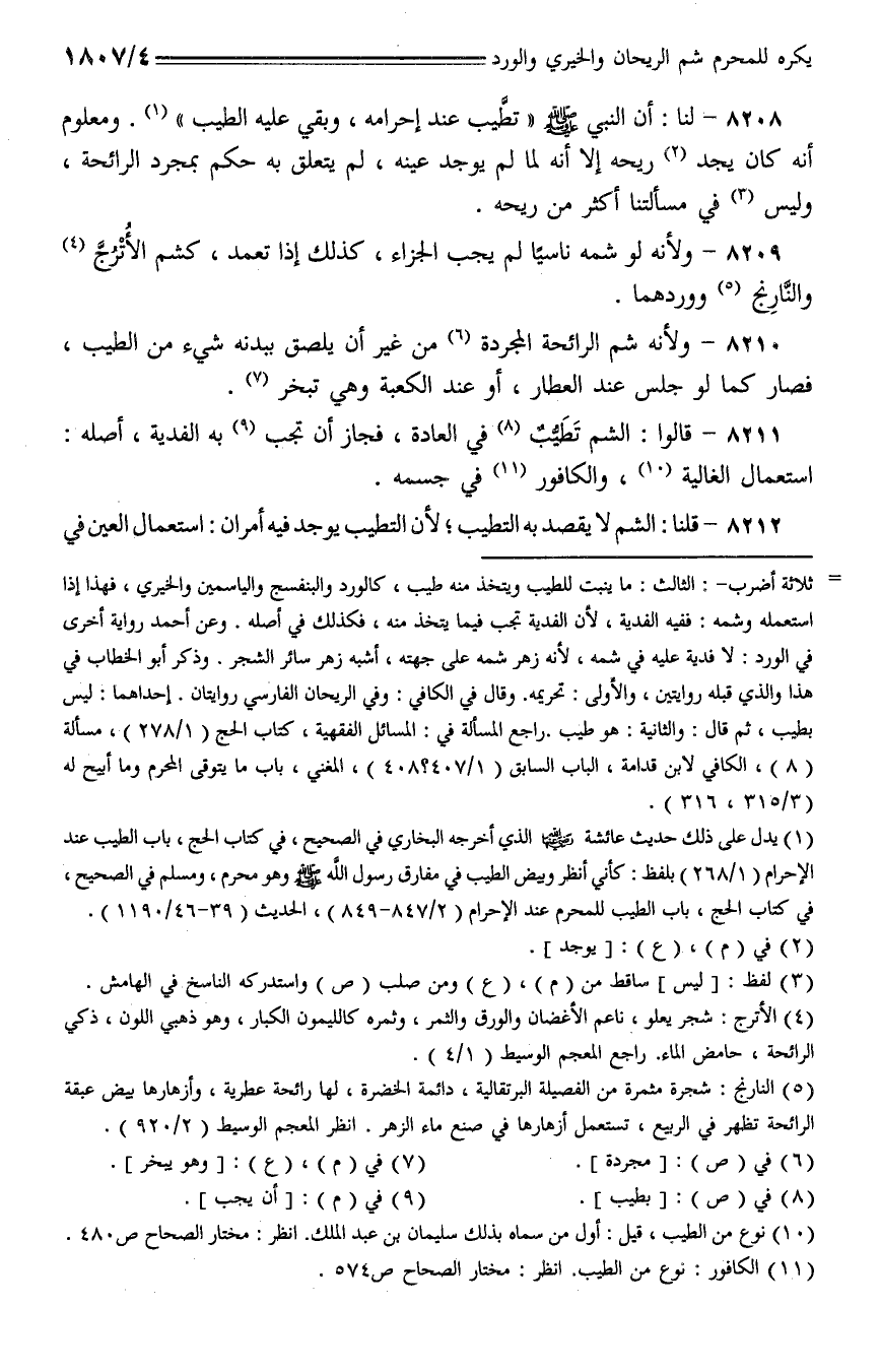 8209 - ولأنه لو شمه ناسيًا لم يجب الجزاء، كذلك إذا تعمد، كشم الأترج والنارنج ووردهما.