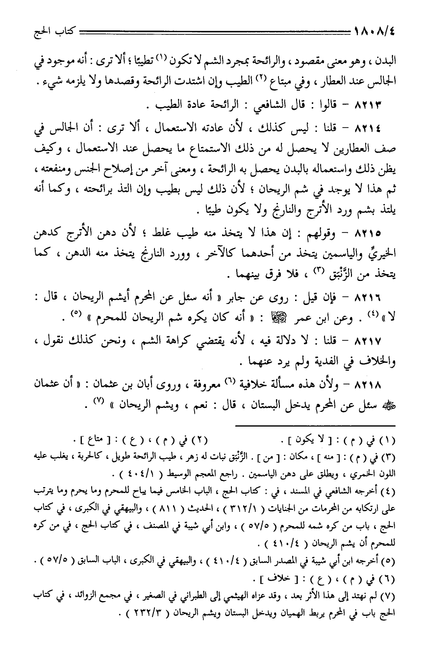 8218 - ولأن هذه مسألة خلافية معروفة، وروى أبان بن عثمان: (أن عثمان - رضي الله عنه - سئل عن المحرم يدخل البستان، قال: نعم، ويشم الريحان).