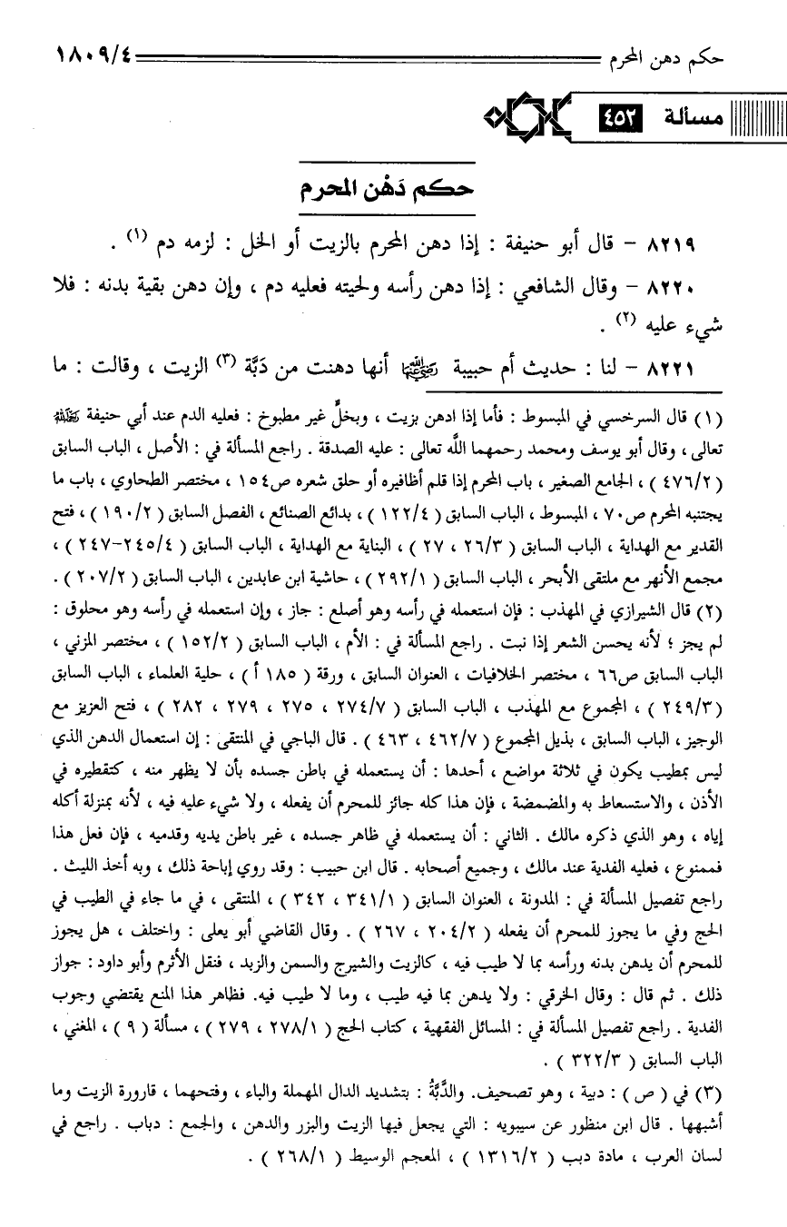8219 - قال أبو حنيفة: إذا دهن المحرم بالزيت أو الخل: لزمه دم.