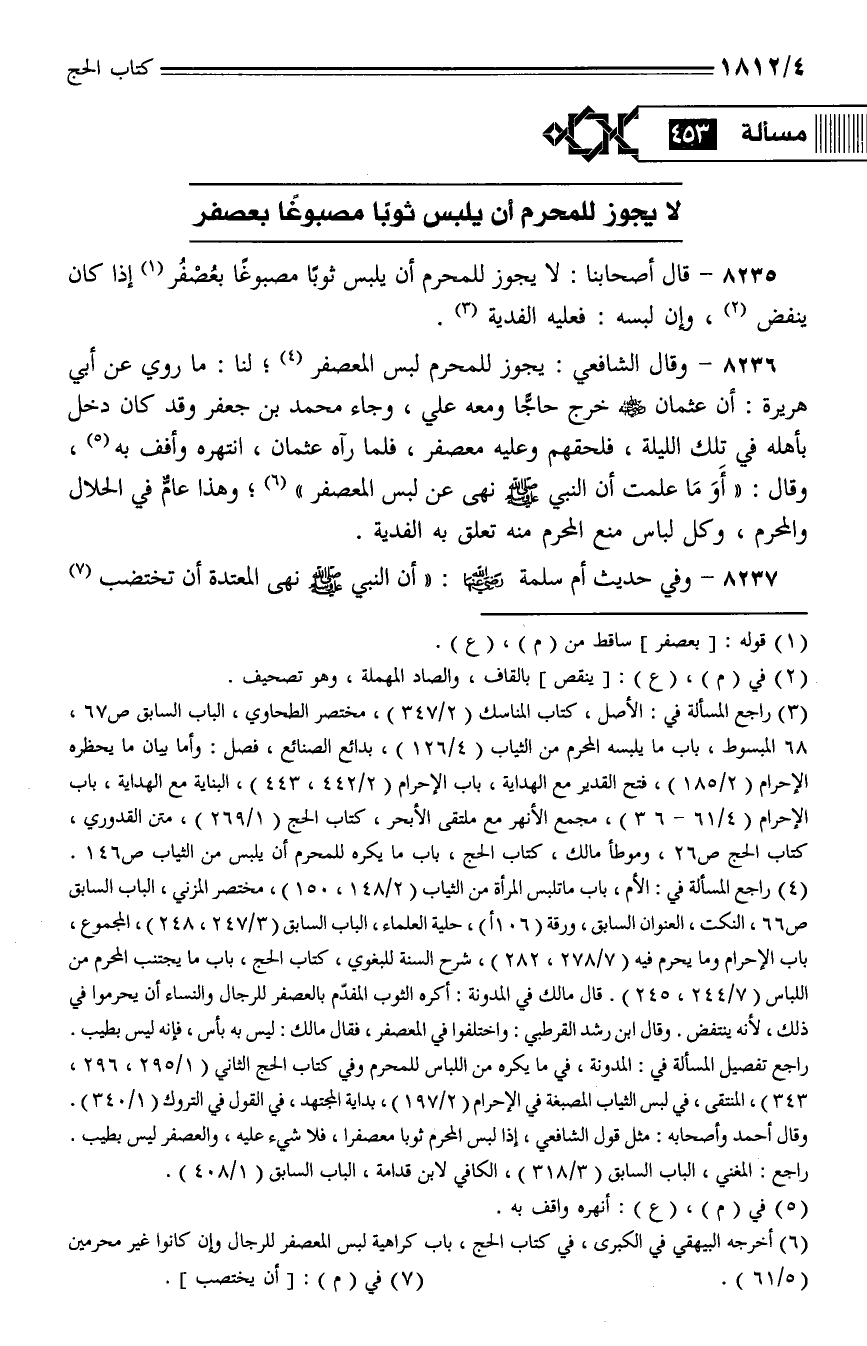 8235 - قال أصحابنا: لا يجوز للمحرم أن يلبس ثوبًا مصبوغًا بعصفر إذا كان ينفض، وإن لبسه: فعليه الفدية.