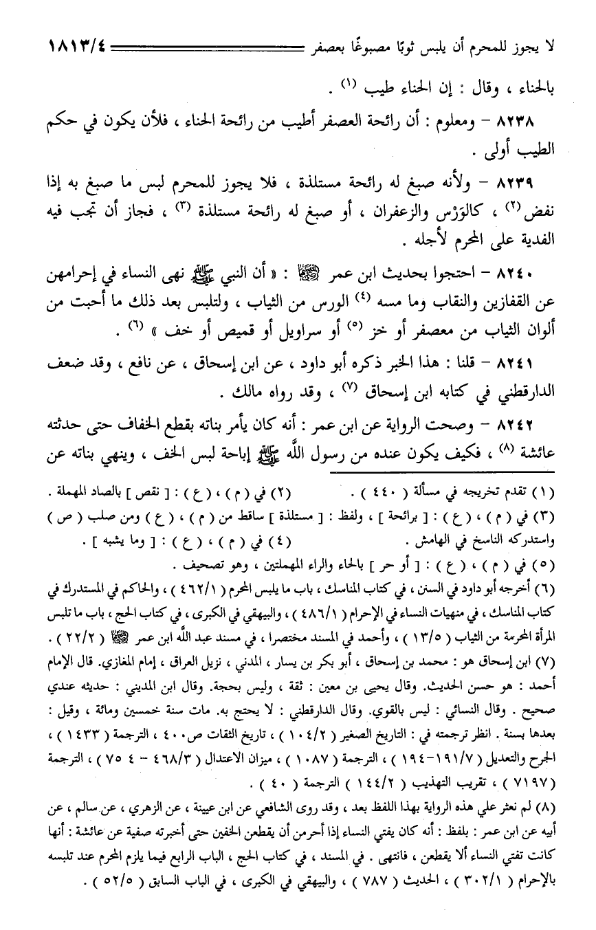 8238 - ومعلوم: أن رائحة العصفر أطيب من رائحة الحناء، فلأن يكون في حكم الطيب أولى.