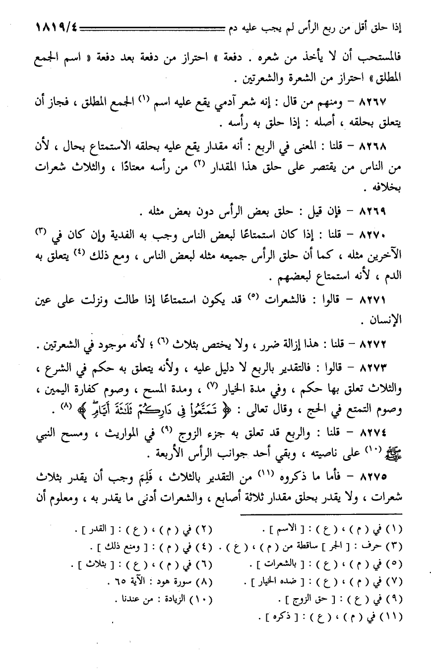 8268 - قلنا: المعنى في الربع: أنه مقدار يقع عليه بحلقه الاستمتاع بحال، لأن من الناس من يقتصر على حلق هذا المقدار من رأسه معتادًا، والثلاث شعرات بخلافه.
