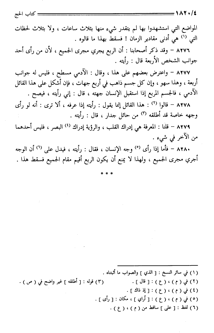 8277 - واعترض بعضهم على هذا، وقال: الآدمي مسطح، فليس له جوانب أربعة، وهذا سهو، وإن كل جسم ذاهب في أربع جهات، فإن أشكل على هذا القائل الآدمي، فالجسم المربع إذا استقبل الإنسان جهته، قال: إني رأيته، فيصح.