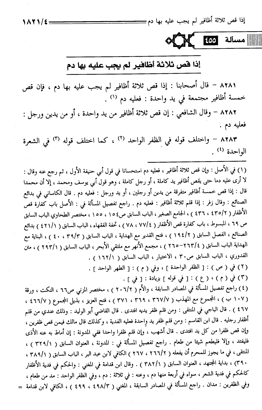 8282 - وقال الشافعي: إن قص ثلاثة أظافير من يد واحدة، أو من يدين ورجل: فعليه دم.