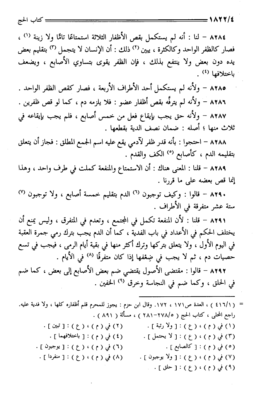 8285 - ولأنه لم يستكمل أحد الأطراف الأربعة، فصار كقص الظفر الواحد.