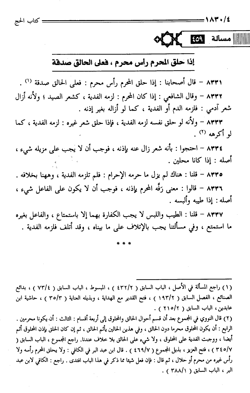 8331 - قال أصحابنا: إذا حلق المحرم رأس محرم: فعلى الحالق صدقة.
