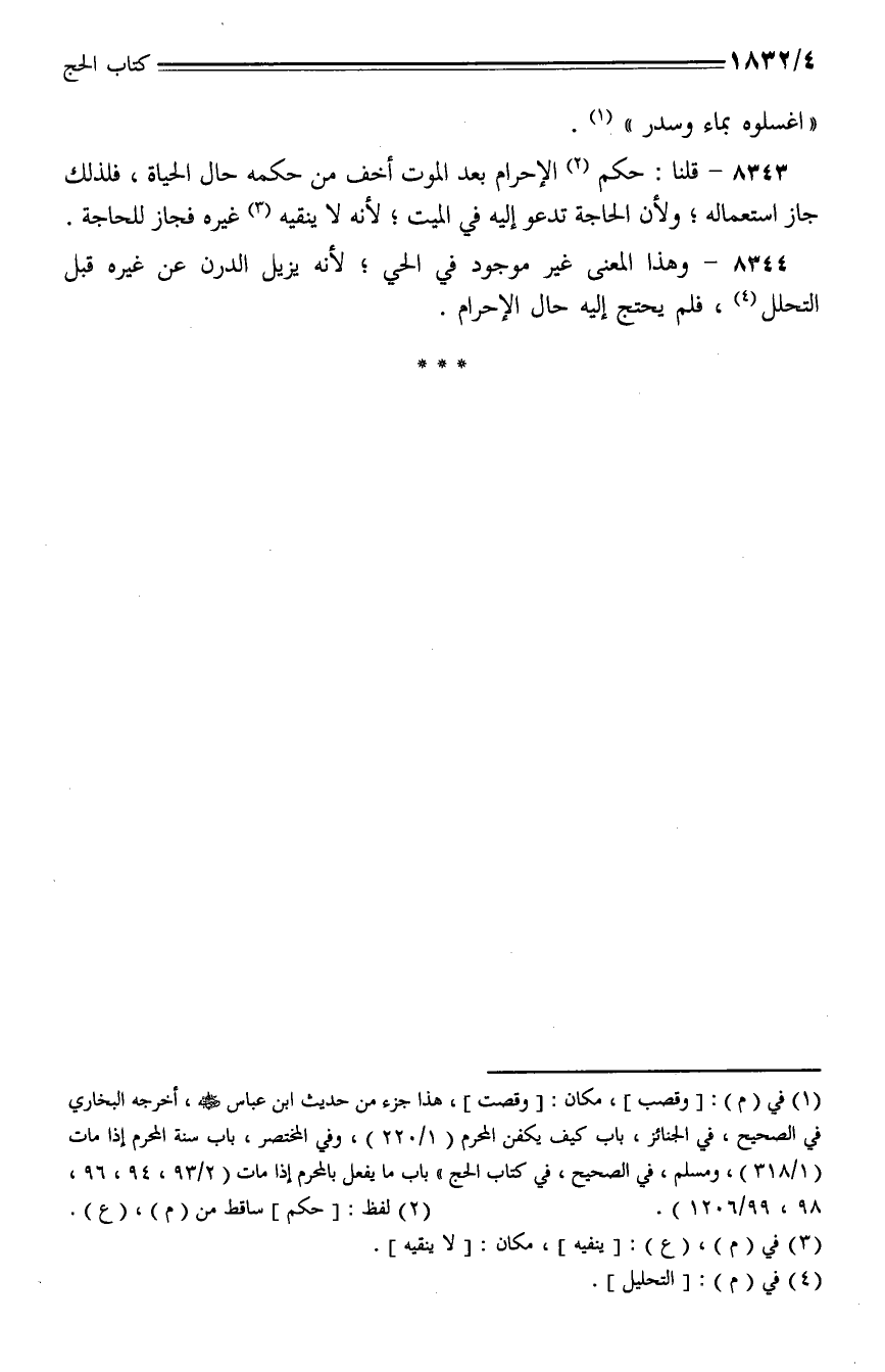 8343 - قلنا: حكم الإحرام بعد الموت أخف من حكمه حال الحياة، فلذلك جاز استعماله؛ ولأن الحاجة تدعو إليه في الميت؛ لأنه لا ينقيه غيره فجاز للحاجة.