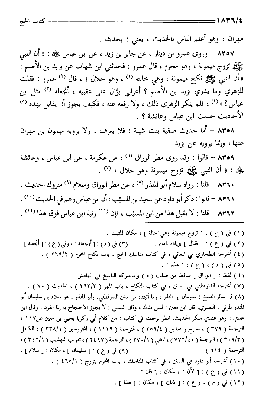 8357 - وروى عمرو بن دينار، عن جابر بن زيد، عن ابن عباس - رضي الله عنه -: (أن النبي - صلى الله عليه وسلم - تزوج ميمونة، وهو محرم، قال عمرو: فحدثني ابن شهاب عن يزيد بن الأصم: (أن النبي - صلى الله عليه وسلم - نكح ميمونة، وهي خالته، وهو حلال)، قال عمرو: فقلت للزهري وما يدري يزيد بن الأصم؟ أعرابي بوَّال على عقبيه، أتجعله مثل ابن عباس؟)، فلم ينكر الزهري ذلك، ولا رفعه عنه، فكيف يجوز أن يقابل بهذه الأحاديث حديث ابن عباس وعائشة؟.