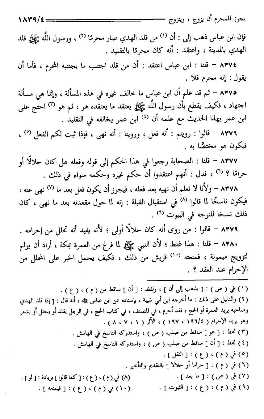 8379 - قالوا: من روى أنه كان حلالاً أولى؛ لأنه يفيد أنه تحلل من إحرامه.