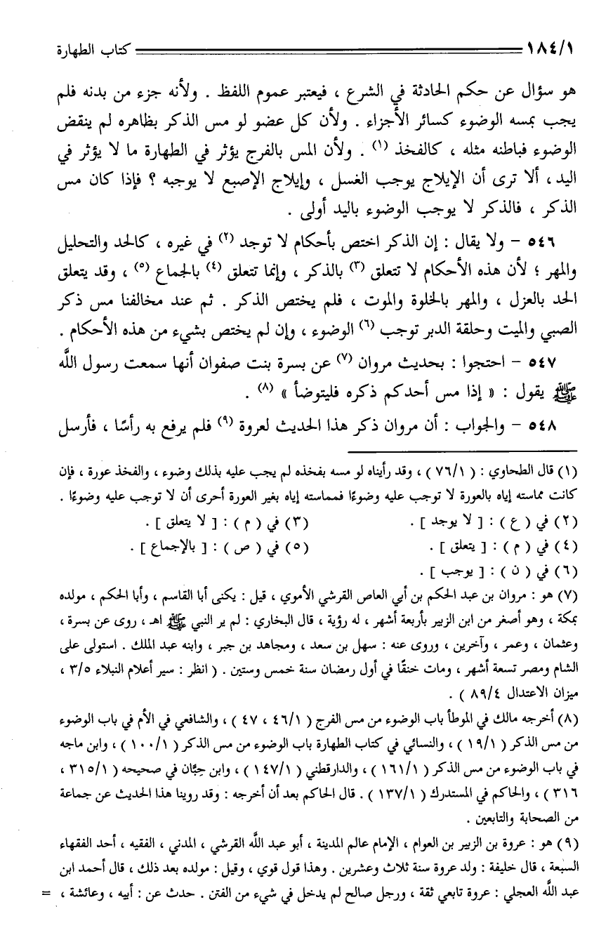 546 - ولا يقال: إن الذكر اختص بأحكام لا توجد في غيره، كالحد والتحليل والمهر؛ لأن هذه الأحكام لا تتعلق بالذكر، وإنما تتعلق بالجماع، وقد يتعلق الحد بالعزل، والمهر بالخلوة والموت، فلم يختص الذكر. ثم عند مخالفنا مس ذكر الصبي والميت وحلقة الدبر توجب الوضوء، وإن لم يختص بشيء من هذه الأحكام.