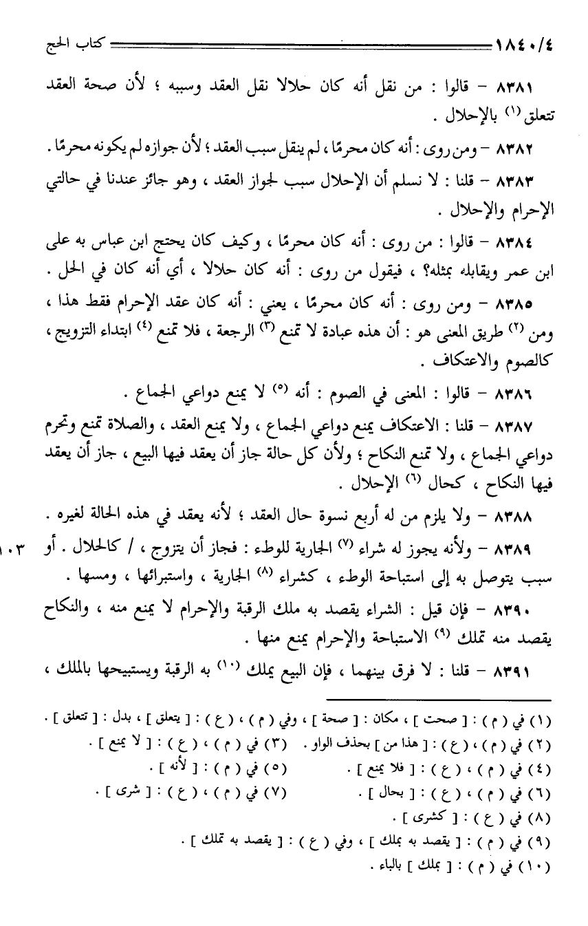 8381 - قالوا: من نقل أنه كان حلالاً نقل العقد وسببه؛ لأن صحة العقد تتعلق بالإحلال.