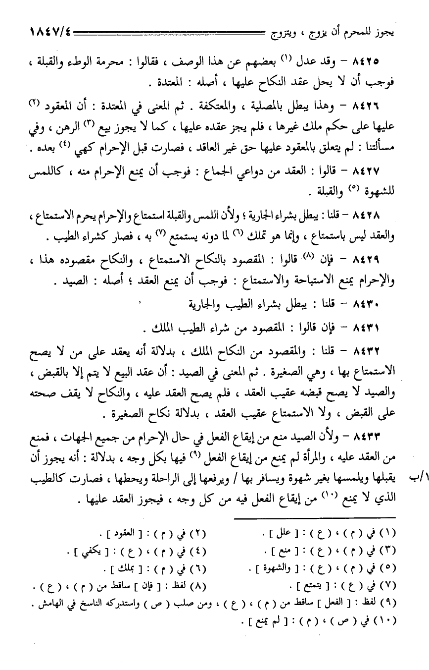 8428 - قلنا: يبطل بشراء الجارية؛ ولأن اللمس والقبلة استمتاع والإحرام يحرم الاستمتاع، والعقد ليس باستمتاع، وإنما هو تملك لما دونه يستمتع به، فصار كشراء الطيب.