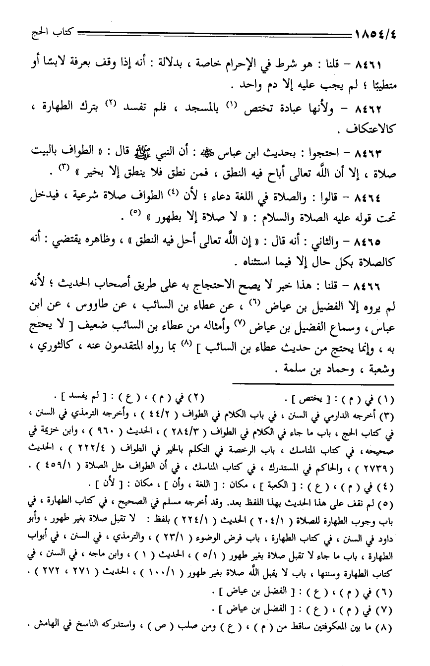 8463 - احتجوا: بحديث ابن عباس - رضي الله عنه -: أن النبي - صلى الله عليه وسلم - قال: (الطواف بالبيت صلاة، إلا أن الله تعالى أباح فيه النطق، فمن نطق فلا ينطق إلا بخير).