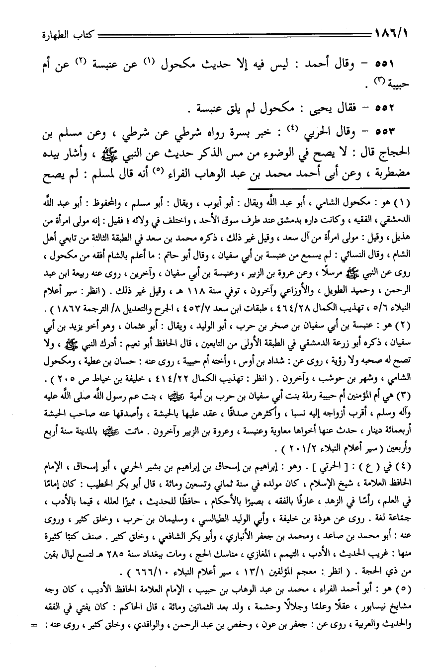551 - وقال أحمد: ليس فيه إلا حديث مكحول عن عنبسة عن أم حبيبة.