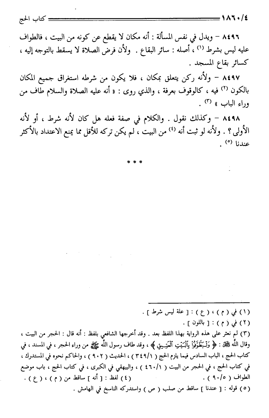 8496 - ويدل في نفس المسألة: أنه مكان لا يقطع عن كونه من البيت، فالطواف عليه ليس بشرط، أصله: سائر البقاع. ولأن فرض الصلاة لا يسقط بالتوجه إليه، كسائر بقاع المسجد.