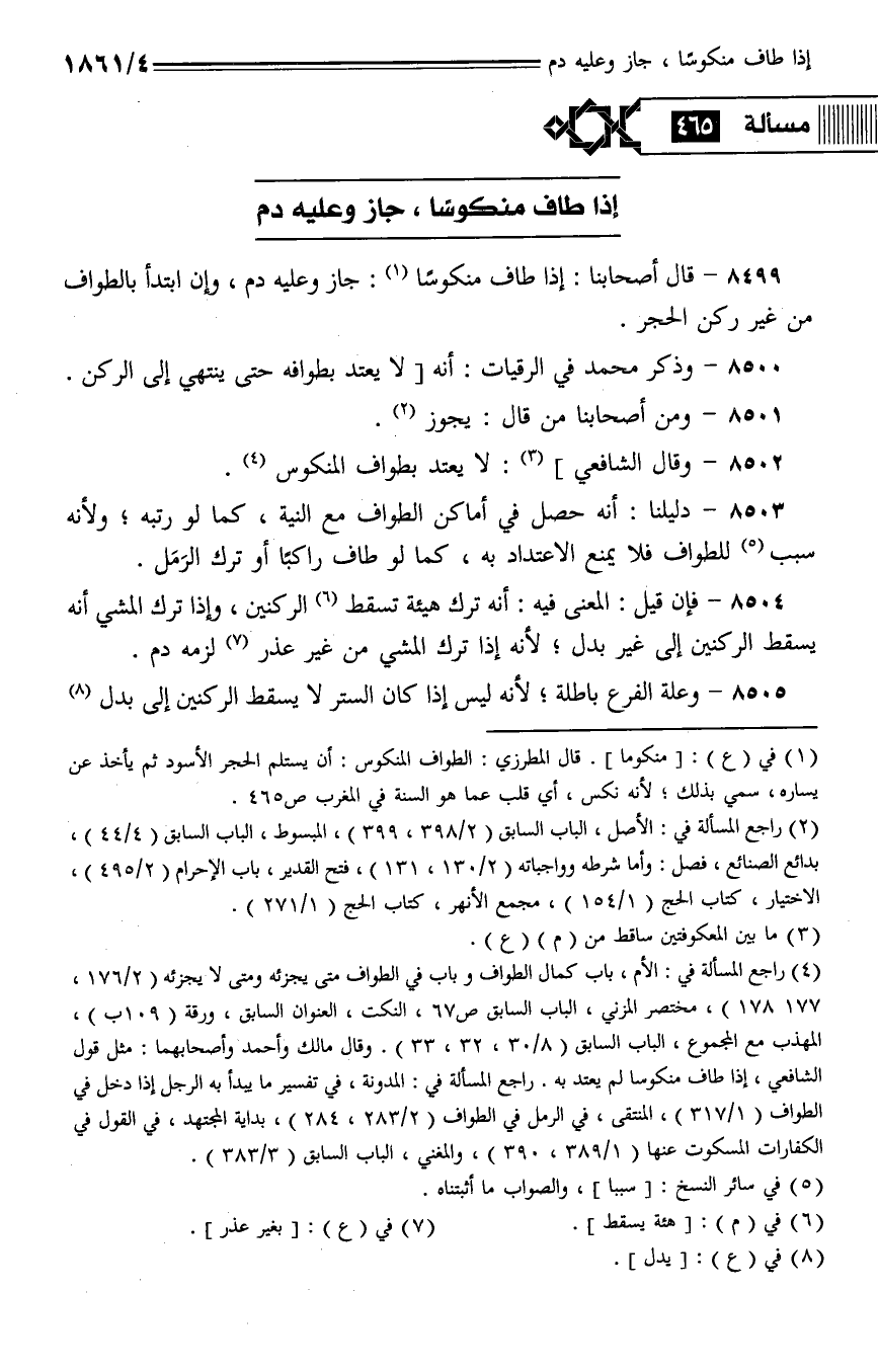 8499 - قال أصحابنا: إذا طاف منكوسًا: جاز وعليه دم، وإن ابتدأ بالطواف من غير ركن الحجر.