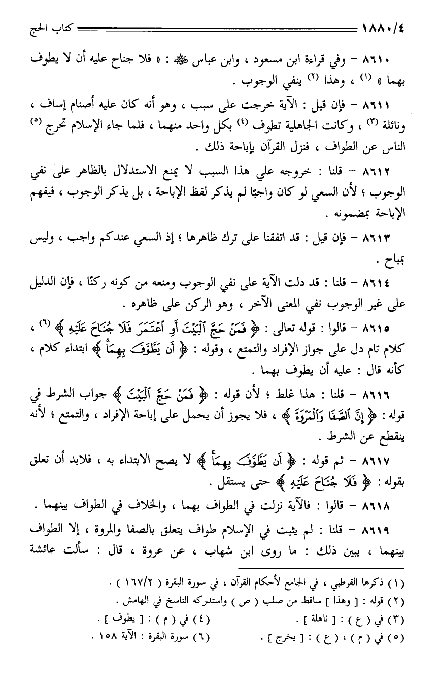 8615 - قالوا: قوله تعالى: {فمن حج البيت أو اعتمر فلا جناح عليه}، كلام تام دل على جواز الإفراد والتمتع، وقوله: {أن يطوف بهما} ابتداء كلام، كأنه قال: عليه أن يطوف بهما.