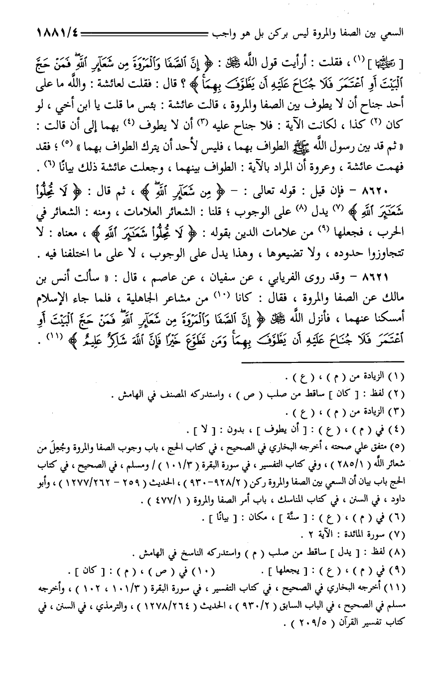 8621 - وقد روى الفريابي، عن سفيان، عن عاصم، قال: (سألت أنس بن مالك عن الصفا والمروة، فقال: كانا من مشاعر الجاهلية، فلما جاء الإسلام أمسكنا عنهما، فأنزل الله - عز وجل - {إن الصفا والمروة من شعائر الله فمن حج البيت أو اعتمر فلا جناح عليه أن يطوف بهما ومن تطوع خيرًا فإن الله شاكر عليم}.