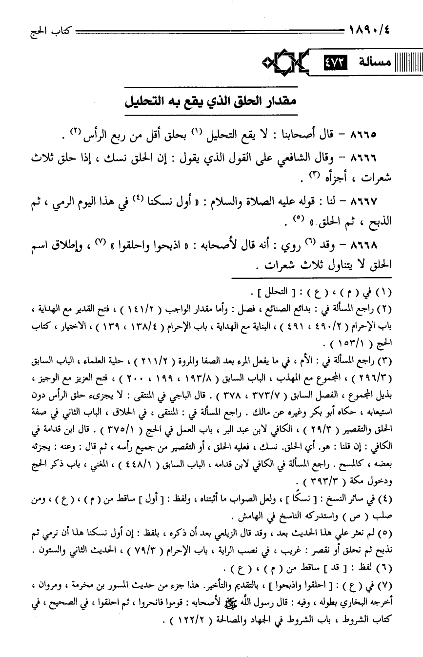 8666 - وقال الشافعي على القول الذي يقول: إن الحلق نسك، إذا حلق ثلاث شعرات، أجزأه.