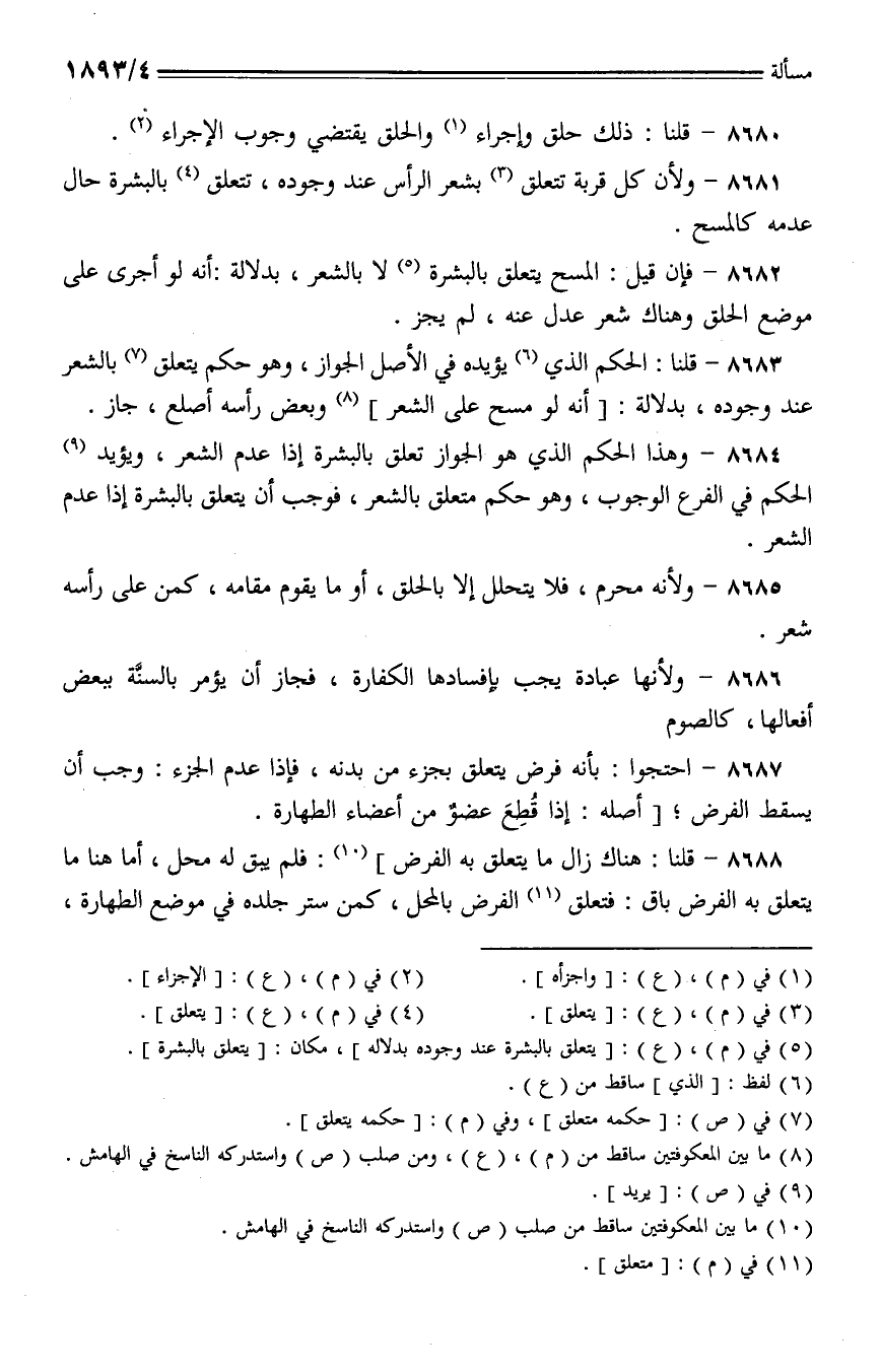 8681 - ولأن كل قربة تتعلق بشعر الرأس عند وجوده، تتعلق بالبشرة حال عدمه كالمسح.
