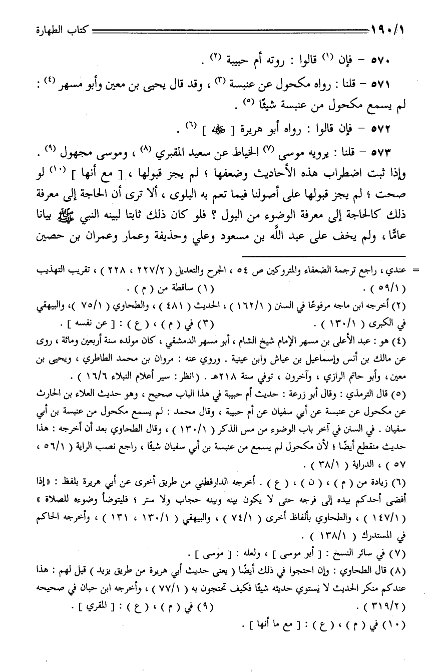 573 - قلنا: يرويه موسى الخياط عن سعيد المقبري، وموسى مجهول. وإذا ثبت اضطراب هذه الأحاديث وضعفها؛ لم يجز قبولها، مع أنها لو صحت؛ لم تجز قبولها على أصولنا فيما تعم به البلوى، ألا ترى أن الحاجة إلى المعرفة ذلك كالحاجة إلى معرفة الوضوء من البول؟ فلو كان ذلك ثابتا لبينه النبي - صلى الله عليه وسلم - بيانا عامًّا، ولم يخف على عبد الله بن مسعود وعلي وحذيفة وعمار وعمران بن حصين
