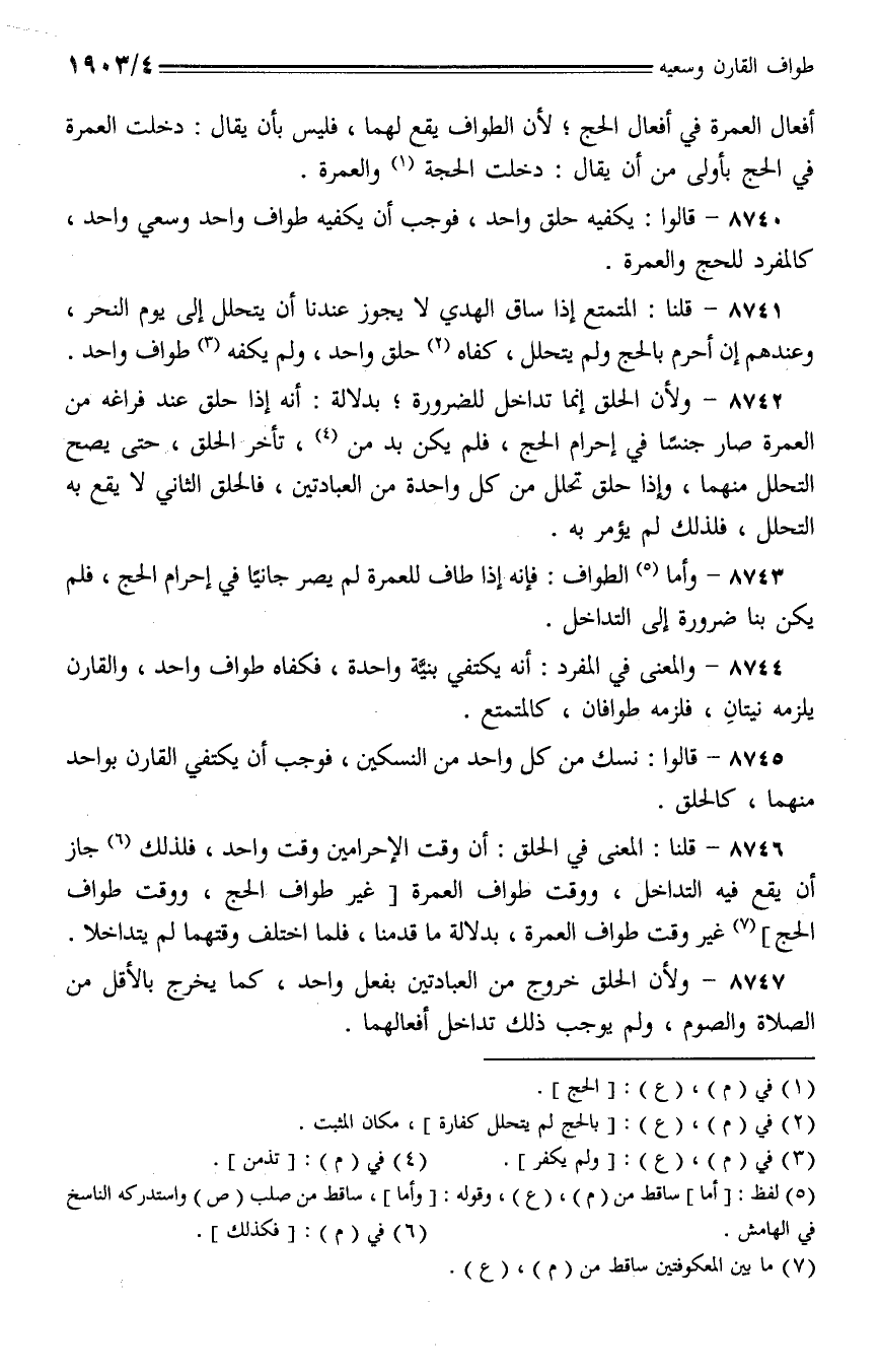 8747 - ولأن الحلق خروج من العبادتين بفعل واحد، كما يخرج بالأقل من الصلاة والصوم، ولم يوجب ذلك تداخل أفعالهما.