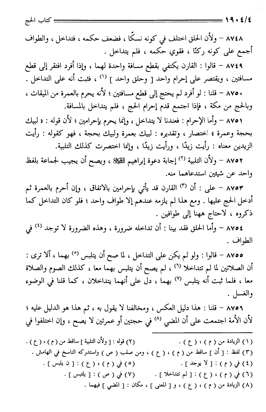 8749 - قالوا: القارن يكتفي بقطع مسافة واحدة لهما، وإذا أفرد افتقر إلى قطع مسافتين، ويقتصر على إحرام واحد [وحلق واحد]، فثبت أنه على التداخل.
