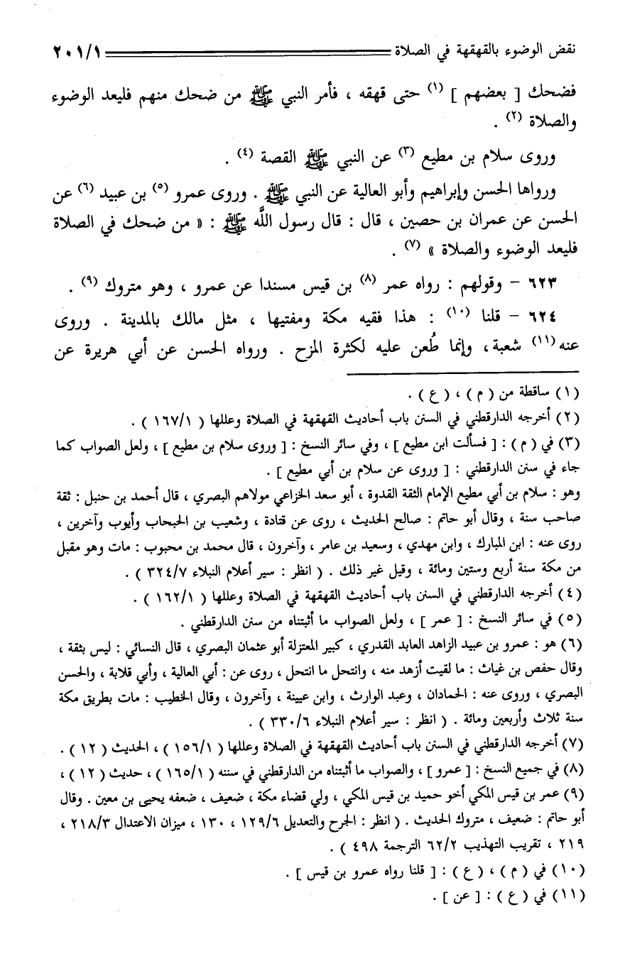 ورواها الحسن وإبراهيم وأبو العالية عن النبي - صلى الله عليه وسلم -. وروى عمرو بن عبيد عن الحسن عن عمران بن حصين، قال: قال رسول الله - صلى الله عليه وسلم -: ((من ضحك في الصلاة فليعد الوضوء والصلاة)).