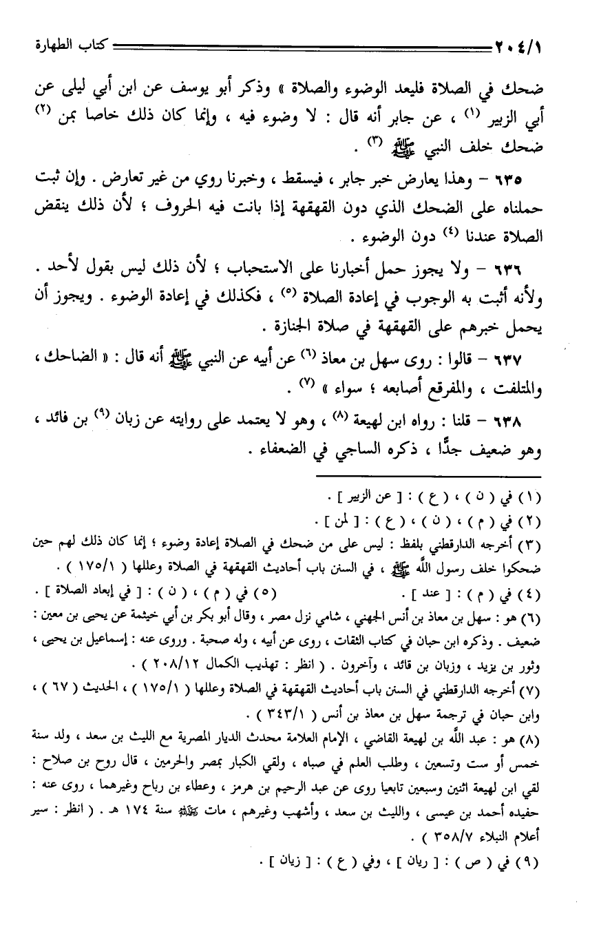 ضحك في الصلاة فليعد الوضوء والصلاة)) وذكر أبو يوسف عن ابن أبي ليلى عن أبي الزبير، عن جابر أنه قال: لا وضوء فيه، وإنما كان ذلك خاصا بمن ضحك خلف النبي - صلى الله عليه وسلم -.