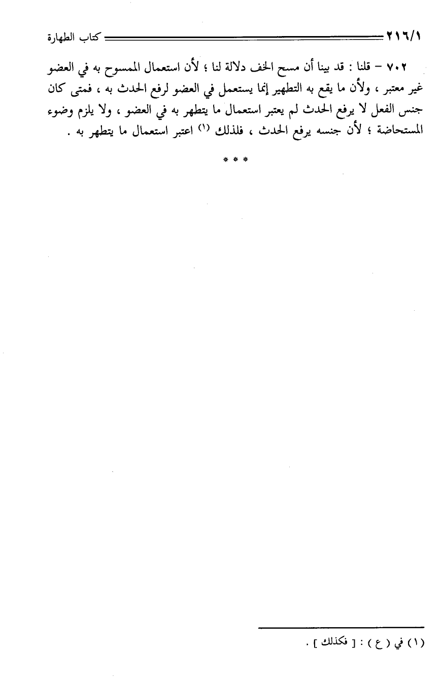 702 - قلنا: قد بينا أن مسح الخف دلالة لنا؛ لأن استعمال الممسوح به في العضو غير معتبر، ولأن ما يقع به التطهير إنما يستعمل في العضو لرفع الحدث به، فمتى كان جنس الفعل لا يرفع الحدث لم يعتبر استعمال ما يتطهر به في العضو، ولا يلزم وضوء المستحاضة؛ لأن جنسه يرفع الحدث، فلذلك اعتبر استعمال ما يتطهر به.