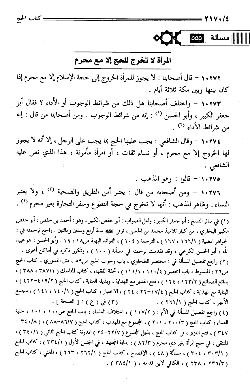 10272 - قال أصحابنا: لا يجوز للمرأة الخروج إلى حجة الإسلام إلا مع محرم إذا كان بينها وبين مكة ثلاثة أيام.