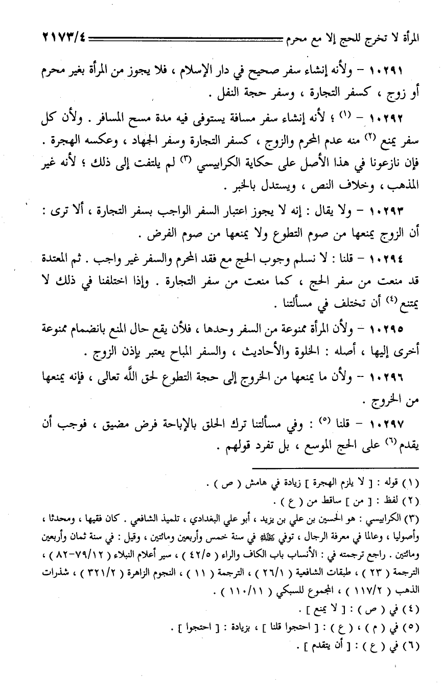 10292 - ؛ لأنه إنشاء سفر مسافة يستوفى فيه مدة مسح المسافر. ولأن كل سفر يمنع منه عدم المحرم والزوج، كسفر التجارة وسفر الجهاد، وعكسه الهجرة. فإن نازعونا في هذا الأصل على حكاية الكراييسي لم يلتفت إلى ذلك؛ لأنه غير المذهب، وخلاف النص، ويستدل بالخبر.